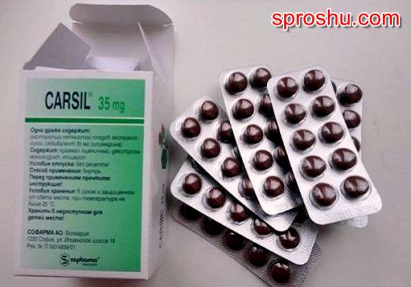 Карсил является экстрактом плодов расторопши. Он восстанавливает клетки печени при воспалении, метаболических нарушениях, перерабатывает токсические вещества.