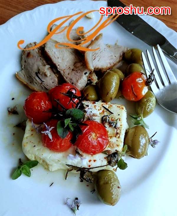 - запечённый овечий сыр с пряными травами, оливковым маслом, оливками и томатами,