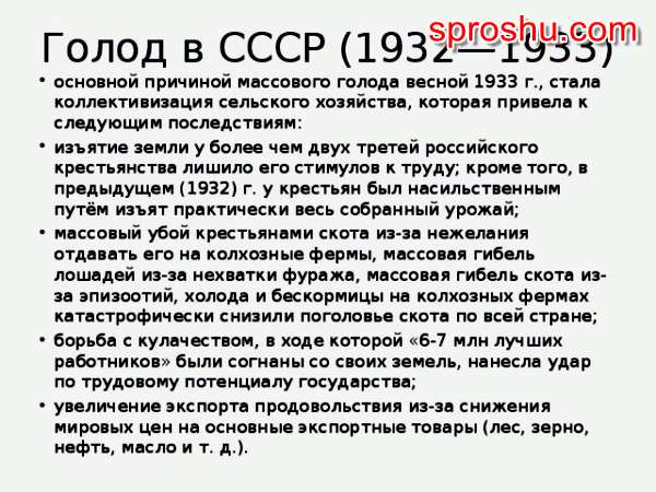 причин несколько. первая - неурожай. вторая - сопротивление коллективизации - намеренное уничтожение урожая кулаками и подкулачниками, отказ от сбора урожая, по принципу пусть лучше пшеница гниет чем достанется красным. и третья, главная, проистекающая из второй - жадность крестьян. не желая сдавать зерно государству и пытаясь его скрыть, крестьяне прятали его в ямах не подготовленных под зернохранение. в результате зерно было заражено грибком. в последствии при приготовлении хлеба из зараженного зерна народ заболевал. вздутые животы и последующая смерть - следствия заболевания людей грибком. от голода живот никогда не вздувается. взгляните на снимки узников концлагерей второй мировой войны, там никто не найдет ни одного со вздутыми животами.
