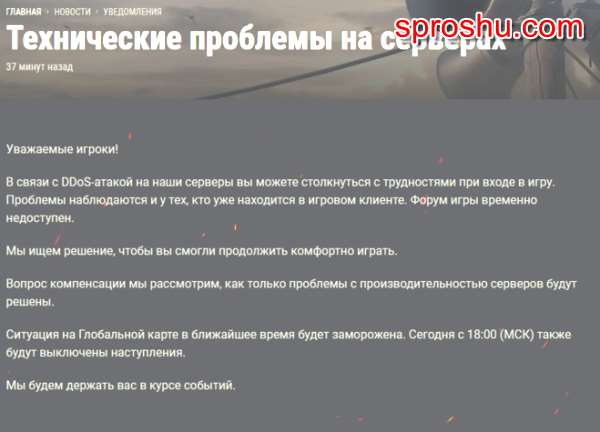 Несколько часов назад на всех серверах начались жуткие лаги, просто действие которые я пытался сделать, делались через несколько секунд, что затрудняло игру. Я перешел на другой сервер но это не прекратилось. В итоге я закрыл игру и решил ждать новостей на сайте ВГ и наконец то я увидел, что на игру начались DDoS атаки. В итоге нас заверили что будет компенсация, а также решают эту проблему. Глобальная карта заморожена до завтра 18:00 по МСК и укрепрайон.