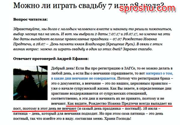 Рождество Иоанна Крестителя или Предтечи выпадает на 7 июля. Это праздник и причем большой, но несмотря на праздничный день тут еще и время поста, а в пост в церкви венчаний не проводят. Так что лучше другую дату для венчания выбрать. Однако если вы выбираете дату для росписи в ЗАГСе, то вам никто не запретит пожениться 7 июля. Так же нет запретов никаких для людей не православной веры. Если вы верующий человек и распишетесь в ЗАГСе со своим супругом или своей супругой, то отгулять свадьбу надо скромно и с постными блюдами на столе. Лучше все же дождаться окончания поста и выбрать не праздничный день, когда все-таки венчают в церкви и свадьбу можно справить нормально. В подтверждение ответ священника.