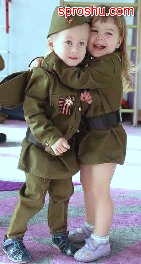Мы в детстве тоже наряжались как могли в военную форму а сейчас это не вопрос пошел и купил, она воспитывает в ребенке патриотизм, я после игры в войну всегда шел в библиотеку и читал книги воспоминания и Ковпака и Сабурова, кто не знает это командиры партизанских отрядов, герои Советского Союза, и Ковпак чистый Украинец, увидел бы он что сейчас происходит, своей знаменитой нагайкой отхлестал бы всех этих Порошенко. Но не об этом, так вот дети в форме хотят знать историю своей страны а не ту пропаганду которую несут с Запада и наши либералы, так что лучше одевать их в форму, чтобы потом их не одели в розовое и голубое и вы были бы родитель один и родитель два.