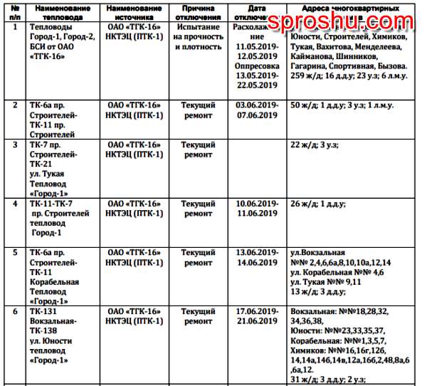 Какой график отключения горячей воды в Нижнекамске в 2019 году?