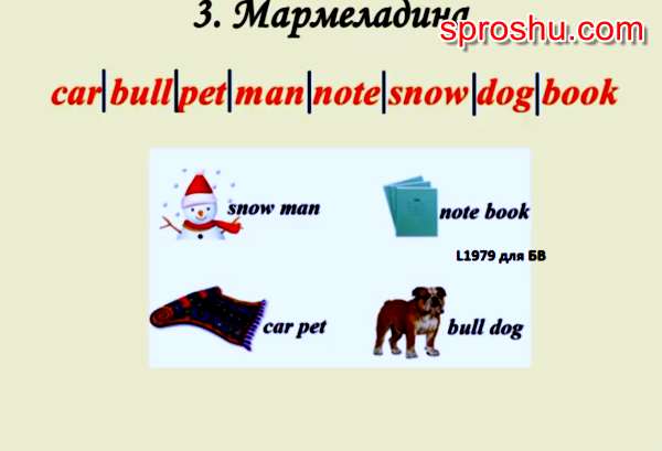 Суть данного задания состоит в том, чтобы из данных английских слов самостоятельно составить четыре новых слова. Составленные слова приобретут новое значение. Слова, которые даны: snow (снег), car (автомобиль), man (мужчина, человек), note (заметка, записка), bull (бык, телец), dog (собака), book (книга), pet (домашний любимец, питомец, домашнее животное). С помощью данных простых слов можно образовать составные, которые приобретут совсем другой смысл: snowman (снеговик) snow + man; notebook (записная книжка, тетрадь) note + book; carpet (ковер) car + pet; bulldog (собака породы бульдог) bull + dog.