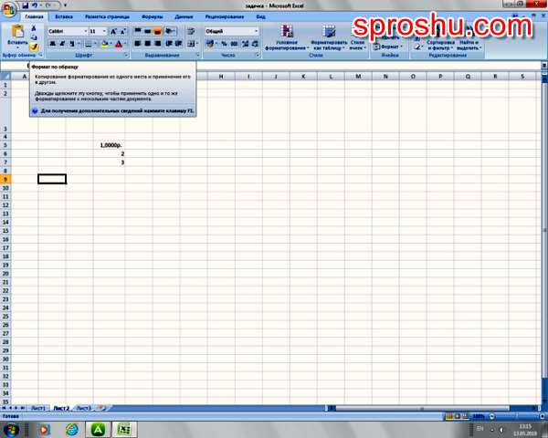 Нужно выделить ту ячейку, у которой тот формат, что нам нужен. Затем выбираете команду "формат по образцу" в меню "главная", эта команда также выбирается путем нажатия на значок в виде метелки или кисти (тут уж кто как видит).
