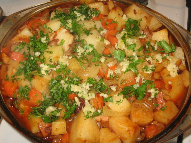 Для приготовления блюда под названием "печеня по-житомирски" потребуются 130 грамм свинины, 30 грамм сала, 260 грамм картошки, 60 грамм репчатого лука, 40 грамм морковки, 15 грамм сушёных грибов, 25 грамм томатного пюре, 3 грамма чеснока, лаврушка, поваренная соль, чёрный свежемолотый перец.