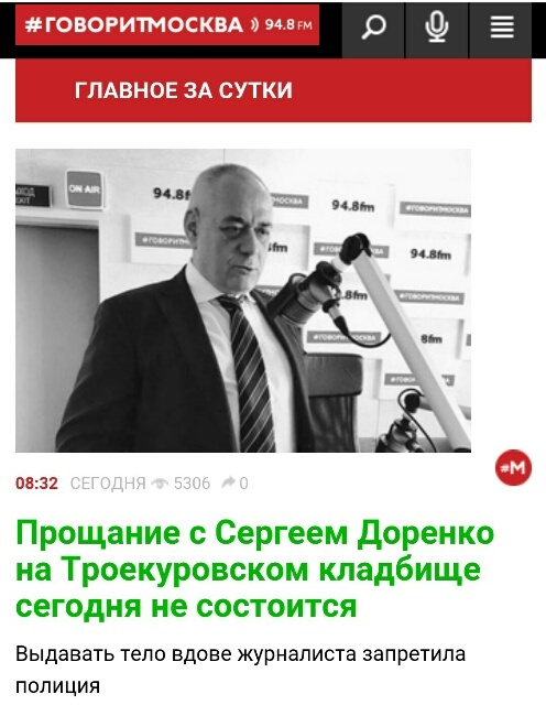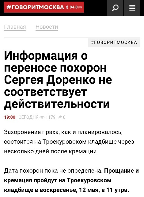 Радиостанция Говорит Москва, основателем и главным редактором которой был Сергей Доренко, информацию о переносе похорон опровергает, но пишет, что прощание и кремация пройдут, как и запланировано, 12 мая в 11 ч на Троекуровском кладбище. А захоронение праха - через несколько дней.