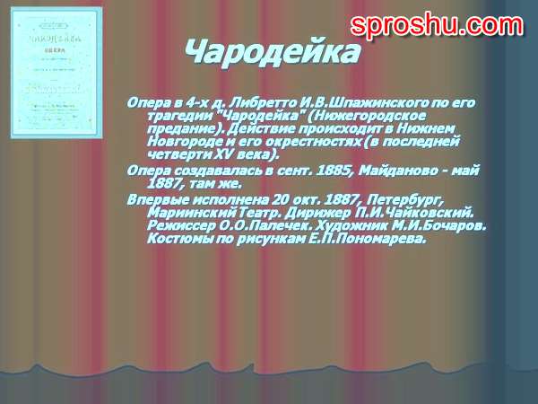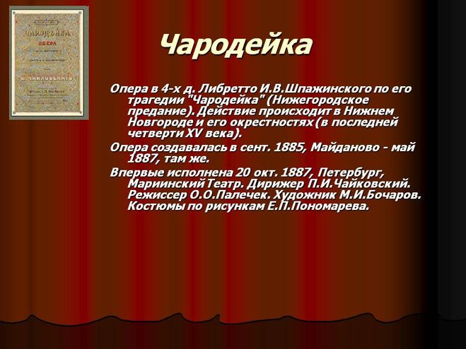 В основу оперы Петра Ильича Чайковского "Чародейка" легла одноименная драма русского драматурга Ипполита Васильевича Шпажинского.