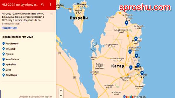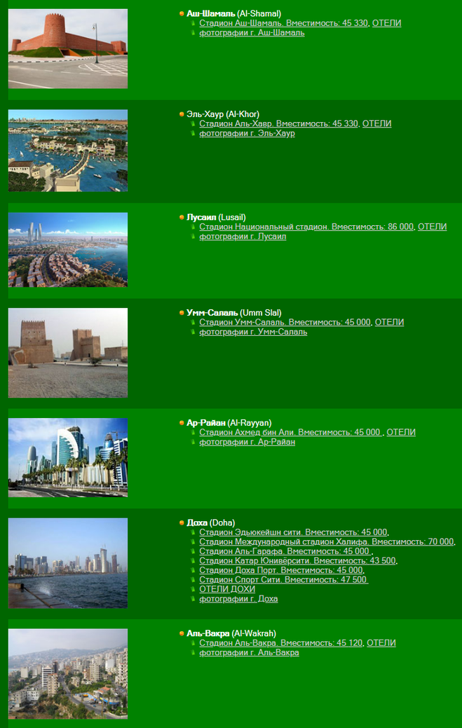 Но обо все по порядку. Городов точно будет семь (по количеству муниципалитетов) - это Доха (столица Катара), Лусиал, Умм-Салаль, Вакра, Эль-Хаур, Аш-Шамаль (самый северный), Ар-Райан. Для русскоязычных запомнить названия будет невероятно сложно, хотя их и немного. Со стадионами ситуация следующая. Полностью готовы только два стадиона, остальные либо реконструируют (расширяют вместительность), либо строят с нуля. Все должно быть готово за год до начала чемпионата, так что через два с небольшим года узнаем их количество и их названия (пока все на уровне предположений).