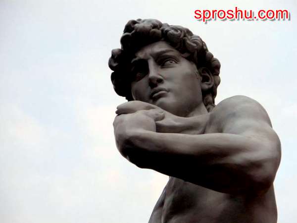 Если не вдаваться в дальнейшее рассмотрение скульптуры, со всех сторон, то вспомним, кто такой Давид. А это юноша, победивший Голиафа, огромного мужчину, тем, что запустил с пращи в него камень.