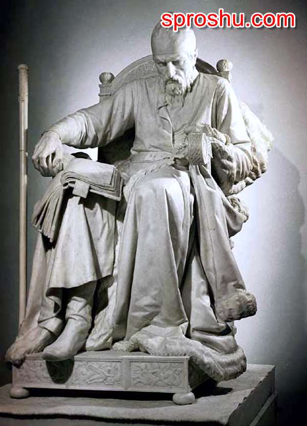 На памятнике Иван Грозный не читает книгу, он отложил ее на правое колено. Лицо его выражает гнев, он, кажется, недоволен книгой и замышляет расправу. Из этого я делаю вывод, что это "Часовник", после издания которого Иван Федоров свернул свою деятельность в Московии.