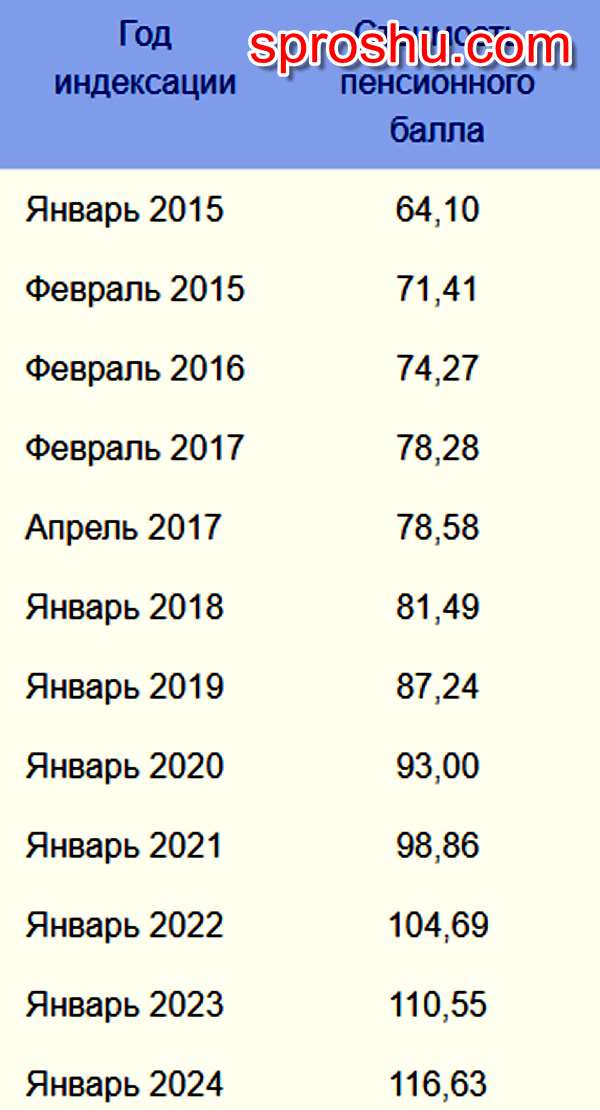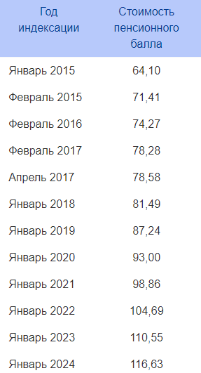 Кстати, стоимость пенсионного балла для пенсионера разная, и зависит от года выхода его на пенсию.Вот таблица стоимости баллов: