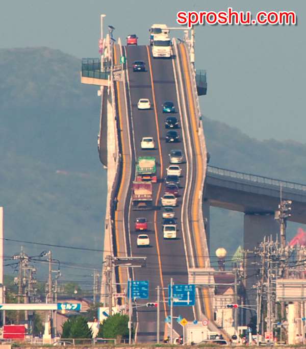 Мост Есима Охаси в Японии соединяет города Мацуэ и Сакаиминато. В нем нет ничего необычного, но он популярен именно благодаря тому, что при некоторых ракурсах съемки создается оптическая иллюзия необыкновенной крутизны. Вот фото этого же моста с другой точки.