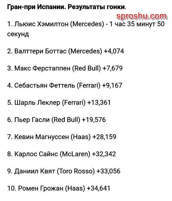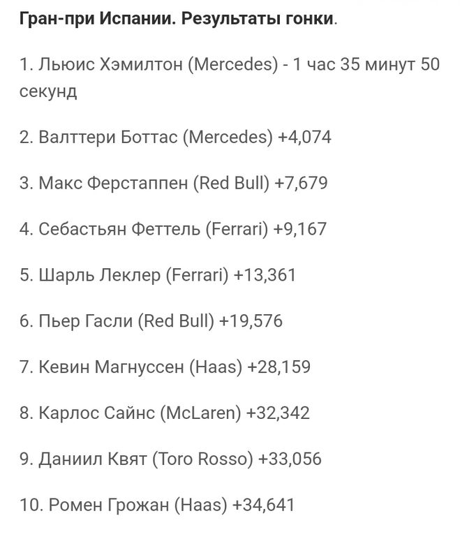 Формула - 1 Гран - при Испании 12. 05. 19 Кто победил? Какие результаты?