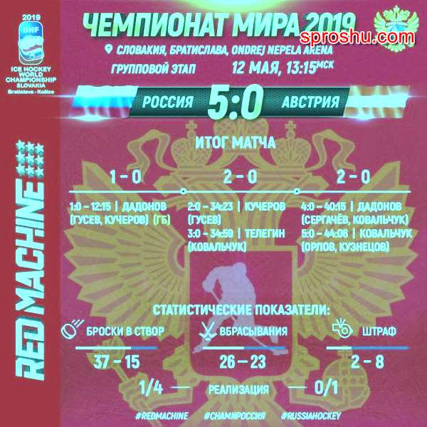 В воскресенье 12 мая сборная России сыграла свой второй матч на чемпионате мира по хоккею 2019. На этот раз нашим соперником была сборная Австрии. Россияне открыли счёт на 13 минуте в большинстве, шайбу забросил Дадонов. Но стоит отметить, что у сборной России было много ошибок, хромала реализация моментов. Австрийцы здорово начали второй период и временами смотрелись не хуже россиян. Не забросили австрийцы лишь из-за классной игры нашего вратаря Георгиева, который в последствии был назван лучшим игроком в составе нашей сборной. Тем не менее с интервалом в 36 секунд Кучеров и Телегин сделали счёт 3:0. Ещё две шайбы были заброшены в начале третьей двадцатиминутки, отличились Дадонов и Ковальчук. Итоговый счёт 5:0 в пользу сборной России, но в игре пока ещё не всё получается. Следующий матч с чехами, вот в нём и увидим реальную силу "Красной машины".