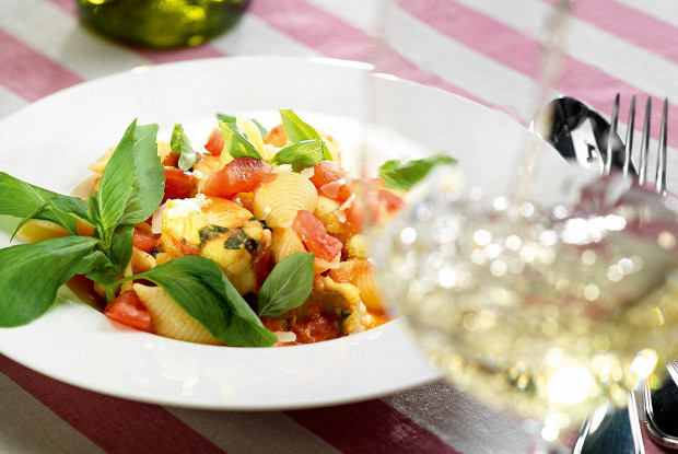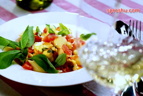 Для приготовления потребуются 400 грамм морского чёрта, 400 грамм томатов, 1 долька чеснока, 200 грамм пасты конкильони, 2 больших ложки оливкового масла, 3 стебля базилика, щепоточка карри, 90 миллилитров белого вина, щепоточка сахарного песка, поваренная соль, чёрный свежемолотый перец.