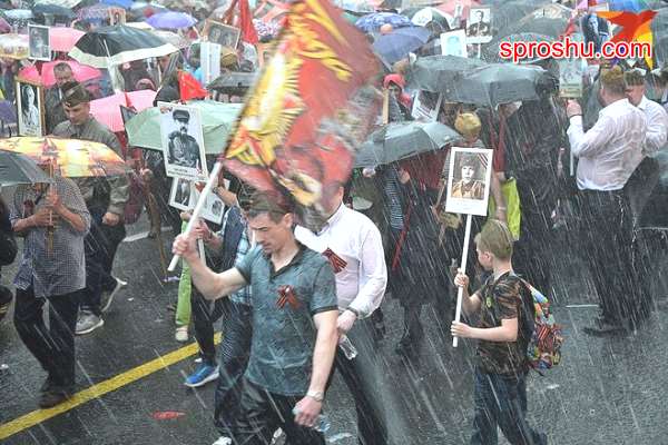 Колонна московского "полка" отправилась в памятный путь в 15.00 от стадиона "Динамо", а завершающей точкой стала Красная площадь. Колонна растянулась на пять километров, причем стройные ряды не дрогнули даже тогда, когда разразилась гроза. Правда, завершилось торжественное шествие чуть раньше, чем ожидалось.