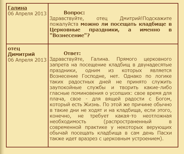 Прямого запрета на посещение кладбища в Вознесение Господне нет в церковных уставах, но верующие сами понимают, что праздник не скорбный и для живых этот. На него ходят накануне в храм на всенощную, потом могут посетить и праздничную службу, большинство причащается. Конечно это все касается тех людей, у кого нет срочной необходимости посетить кладбище. Если похороны, то никак поход не отложишь, если ты сам хоронишь близкого тебе человека. Лучше всего ходить на кладбище в специальные родительские поминальные дни. Вот хорошим днем таким после Вознесения станет Троицкая родительская суббота. Подробнее на ваш вопрос все можно прочитать в ответе священника ниже.