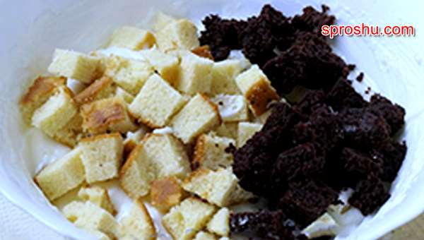 1.Берёте размягченное масло, которое надо смешать c сахаром и co сметаной. Хорошенько перемешиваете. В полученный крем добавляете фрукты, перемешиваете. Затем высыпаете бисквитные обломки, а теперь аккуратно перемешиваете.