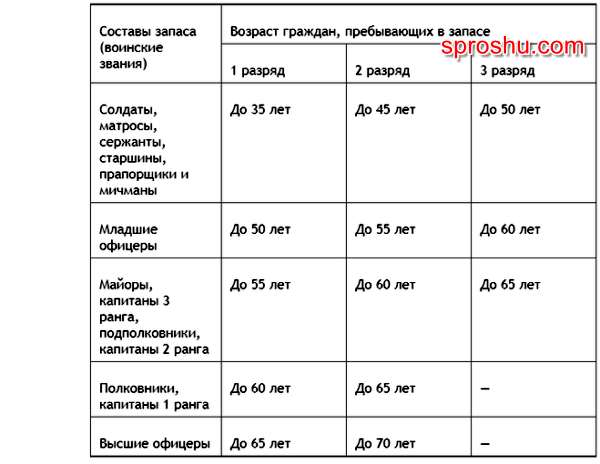 Устанавливается следующий предельный возраст состояния военнообязанных в запасе по разрядам запаса: