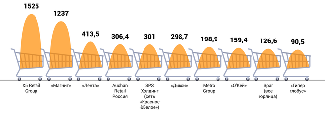 На 2-м месте "Магнит", но шансов восстановить былое лидерство у него всё меньше. 3-я позиция у "Ленты". На 4-й пока "Ашан", но ему в затылок дышит "Красное и Белое" - самая активно растущая сеть ритейла в России, так что в 2019 году французы откатятся на 5-е место.