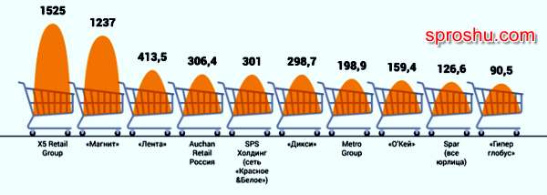 Остальное видно из инфографики за 2018 г. (цифры - выручка в млрд рублей). Плохо идут дела у ОКея и Metro - они постепенно сдают позиции и скорее всего через 2-3 года вообще вылетят из топ-10, а ОКей вероятно вообще будет продан конкурентам.