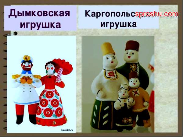 - форме: для дымковской характерны нормальные пропорции, для каргопольской - приземистые фигуры, грубоватые с обобщенными деталями и чертами;