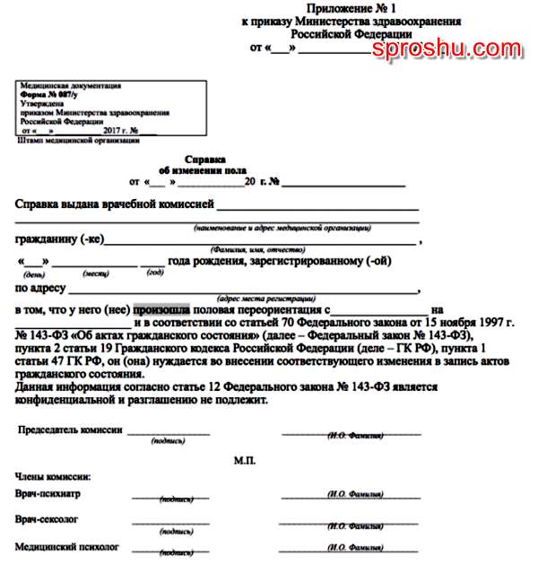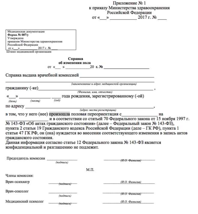 Справку 087/y об изменении пола выдает врачебная комиссия в составе: