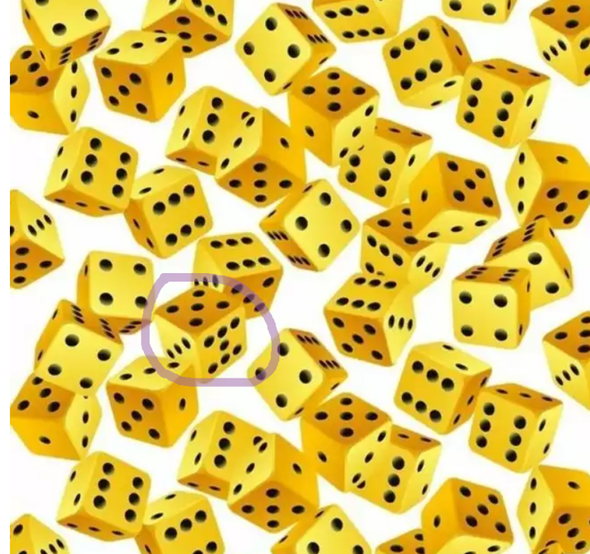 Я сначала подумала, что задачка посложнее, что надо будет смотреть на соотношение точек на соседних гранях каждого кубика, но тут я заметила совершенно аномальный игровой кубик с семью точками на грани, конечно, он неправильный. На своем рисунке я его обвела фиолетовым маркером: