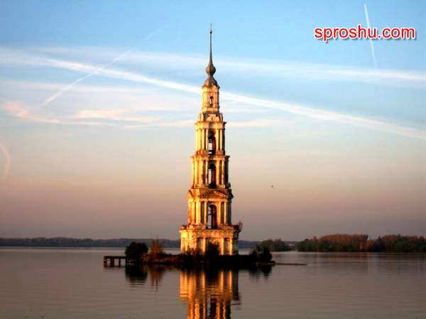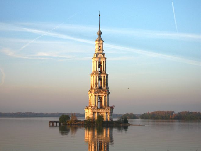 Один из самых известных в России затопленных городов - город Калязин. Находится город Калязин в Тверской области в двести километрах от областного центра - города Твери и 180 километрах на север от города Москвы. Образован был город в 1775 году при соединении трёх слобод указом императрицы Екатерины II. Затопление Калязина произошло в конце тридцатых годов двадцатого века при строительстве Угличской ГЭС и образовании Угличского водохранилища. При затоплении под воды реки Волги ушло 2/3 города - наиболее ценная историческая часть города. Был затоплен Макарьевский монастырь, Николаевский Собор. От Николаевского Собора осталась стоять по среди вод Волги одинокая Колокольня, символизирующая - непотопляемость Руси.