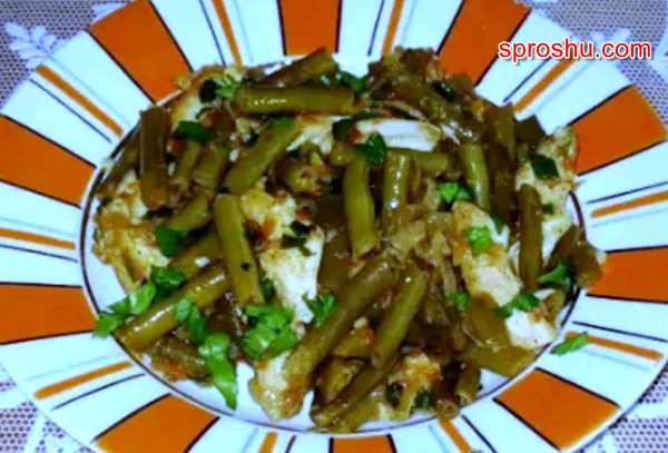 Для приготовления потребуются 600 грамм курицы, 130 грамм лука, 110 грамм топлёного масла, 900 грамм стручковой фасоли, 200 грамм томатов, 50 грамм зелени петрушки, поваренная соль, чёрный свежемолотый перец.