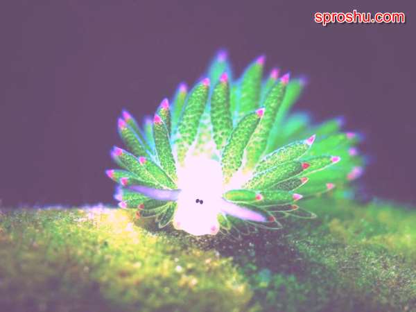 На представленном Вами фото изображён морской брюхоногий моллюск - Костасиелла курошимы (Costasiella kuroshimae), обитающий в прибрежных водах Индонезии, Японии и Филиппинских островов. Вырастает не больше одного сантиметра в длину, основной продукт питания - водоросли, в связи с чем и имеет такую ярко-зелёную окраску. Обладает сложным химическим процессом фотосинтеза (светится в темноте). Жизненный цикл этих существ составляет всего лишь несколько месяцев.