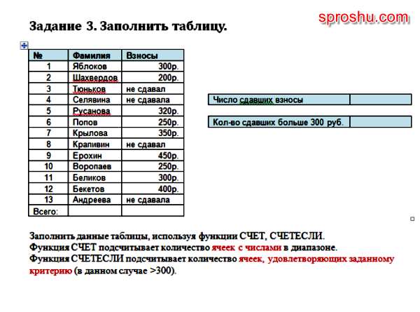 В клетку для подсчета "Число сдавших взносы" ввести формулу =СЧЁТ(С2:С14), выделив поле с данными "Взносы" (в формуле пример поля). Количество сдавших..., введите формулу =СЧЁТЕСЛИ(С2:С14;">3