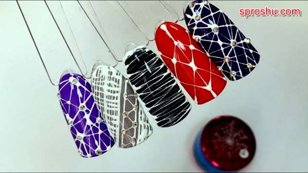 Рисунок "паутинка" можно разнообразить декором - жидкий глиттер,кусочки фольги, стразы и другие ногтевые украшения.
