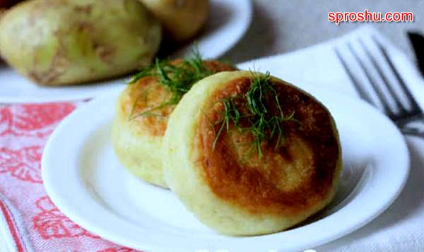 Из полученного картофельного фарша сделаем лепёшечки, в середину выложим свиной фарш и сформируем картофельные пампушки. Обваляем пампушки в муке и прижарим на разогретой сковородке с подсолнечным маслом с обеих сторон до румяности.