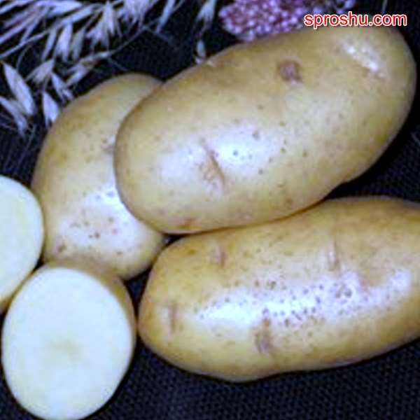 Цвет кожуры светло-бежевый, на срезе клубень желтого цвета, урожайность достигает по полведра на каждое растение. Клубни ровные, немного вытянутой формы, весом 200-300 грамм, обычно все ровные.