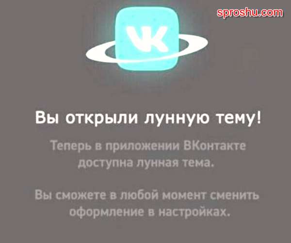 Официально во вконтакте ввели лишь пока только темную тему, это когда фон со светлого меняется на темный. Ажиотаж к этой темной теме немножечко поуменьшился потому что многие себе уже установили эту темную тему. Однако недавно стали появляться другие комментарии - лунная тема, синяя, розовая, летняя, градиентная и т.д. Это все шутка. Если вы увидели такое сообщение как ниже, то знайте, что это обычный фотошоп.
