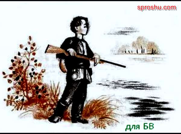 Можно нарисовать и отдельные сцены рассказа, в которых Васютка охотится за тетеревом или в которых он только что обнаруживает неизвестное ранее озеро и стоит удивленым на его берегу.
