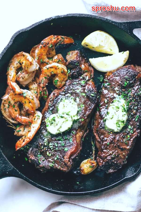 Сейчас стало часто распространенным блюдо когда жарят мясо вместе с креветками. Берутся 2 куска говядины и жарятся на сковородке на растительном масле, посолив, поперчив, и за 5 минут до конца приготовления мяса на сковородке добавляются креветки и чеснок по желанию.