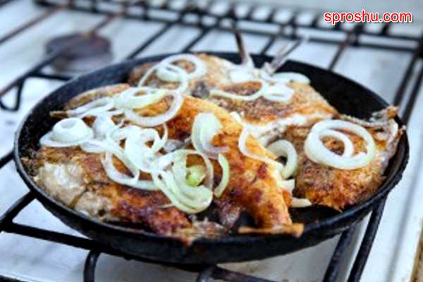 К рыбе очень вкусно будет, если поджарить до легкой золотники лук, нарезанный полукольцами.