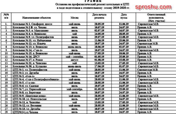 График остановки теплоисточников в Чехове в 2019 году (график отключения ГВС) выглядит так: