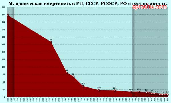 На первый взгляд это действительно может показаться странным. Ведь младенцы такие беззащитные! Малейший холод, инфекции - и они заболевают. А без современной медицины могут погибнуть. У древних людей, конечно, никакой медицины не было. Так и смертность была страшная. Достаточно сказать, что в дореволюционной России даже в ХХ веке умирали до 30% родившихся, как это видно на приведенной диаграмме. А у древних, вполне вероятно, не выживали более 90%. Но жили древние люди в тех местах, где нет суровых зим. И младенцев, как могли, обогревали и защищали от диких зверей. А главное - выживали наиболее приспособленные младенцы, что и позволяло выжить всей популяции людей.