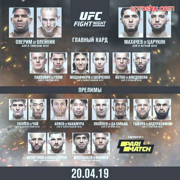 В предварительном карде очень много интересных поединков российских спортсменов таких как Мовсар Евлоев, Саша Яковлев, Алиев, Абдирахимов и предварительный кард можно посмотреть начиная с 17:00 по московскому времени вот на этом сайте.
