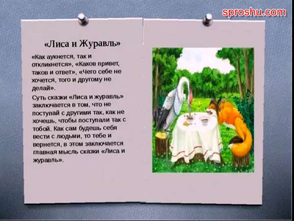 Первое это конечно вспоминается поговорка " Как аукнется, так и откликнется ", тоесть поступившая не правильно и грубо лиса получила точно такое же отношение со стороны журавля. ( Лиса угостила журавля манной кашей на плоской тарелке, а он в ответ угостил лису сметаной в глубоком кувшине.