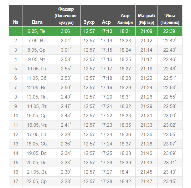 Ифтар (вечерний ужин) и сухур (завтрак перед рассветом) для мусульман особо важны ибо в другое время приходится придерживаться поста. В каждом городе время может разнится сухура и ифтара. Для расчета времени пользовались методом Мусульманской всемирной лиги. Теперь смотрим таблицу.