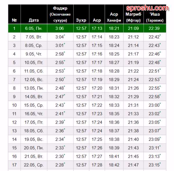 Время сухура и ифтара для месяца рамадан в 2019 году для Санкт-Петербурга?