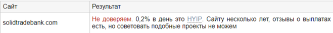 Сайту уже несколько лет, на нем есть отзывы о выплатах. Проверка на мошенничество выдало такой результат, где первые слова выделены красным цветом Не доверяем, дальше идет пояснение о сфере деятельности HYIP, которое означает High Yield Investment Program, а переводится как инвестиционная программа с высоким доходом. На сайте предлагают вложить (инвестировать) свои деньги и вернуть обратно уже с процентами, однако нет каких-либо гарантий. В этом инвестиционном проекте обещают, что будут использовать вложенные деньги в реальном деле (торговля на биржах, ставки на спорт). Фактически деньги на проценты получают из вложений вновь привлеченных пользователей. Вывод: это финансовая пирамида.