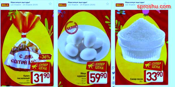 Кулич пасхальный - 36 процентов. Цена - 31.90 руб. за 100 гр. На белые куриные яйца цена - 59.90 рублей за 10 штук.