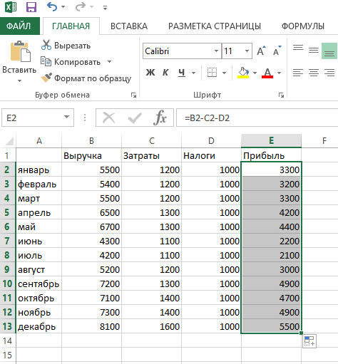 Чтобы применить формулу для всех ячеек в данном случае, ее нужно выделить и скопировать путем протягивания за маленький зеленый квадратик на все ячейки, в которых нужно вычислить разность.