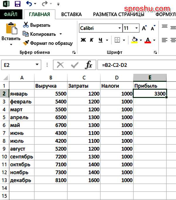 Для того чтобы найти разницу между всеми ячейками нескольких столбцов в Excel, нужно в выбранной ячейке ввести формулу, по которой можно вычислить разность, то есть из уменьшаемого вычесть вычитаемое. Пример приведен ниже, формулу можно видеть в строке формул: